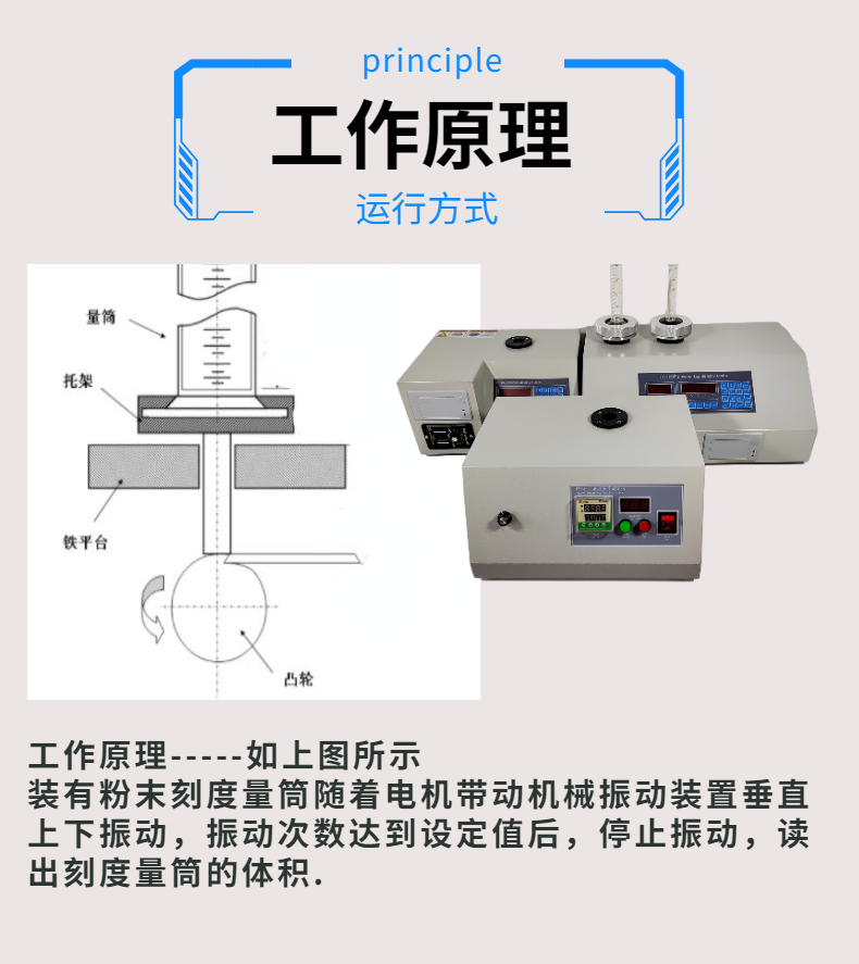 裝有粉末或顆粒的刻度量筒隨著電機帶動機械振動裝置垂直上下振動,振動次數(shù)達到設(shè)定值后,停止振動,讀出刻度量筒的體積.